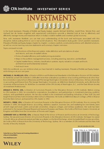 In a world of specialization, no other profession likely requires such broad, yet in-depth knowledge than that of financial analyst. Investments: Principles of Portfolio and Equity Analysis provides the broad-based knowledge professionals and students of the markets need to manage money and maximize return. This companion Workbook, also edited by experts from the CFA Institute, allows busy professionals to gain a stronger understanding of core investment topics. The Workbook Includes learning outcomes, summaries, and problems and solutions sections for each chapter in the main book Blends theory and practice Provides access to the highest quality information on investment analysis and portfolio management