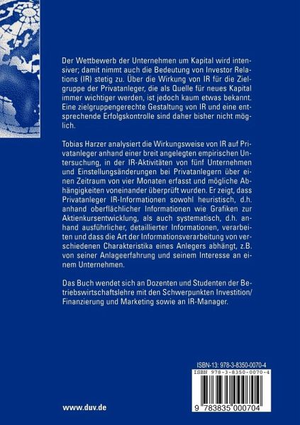 Tobias Harzer analysiert die Wirkungsweise von IR auf Privatanleger anhand einer breit angelegten empirischen Untersuchung, in der IR-Aktivitäten von fünf Unternehmen und Einstellungsänderungen bei Privatanlegern über einen Zeitraum von vier Monaten erfasst und mögliche Abhängigkeiten voneinander überprüft wurden. Er zeigt, dass Privatanleger IR-Informationen sowohl heuristisch, d.h. anhand oberflächlicher Informationen wie Grafiken zur Aktienkursentwicklung, als auch systematisch, d.h. anhand ausführlicher, detaillierter Informationen, verarbeiten und dass die Art der Informationsverarbeitung von verschiedenen Charakteristika eines Anlegers abhängt, z.B. von seiner Anlageerfahrung und seinem Interesse an einem Unternehmen.