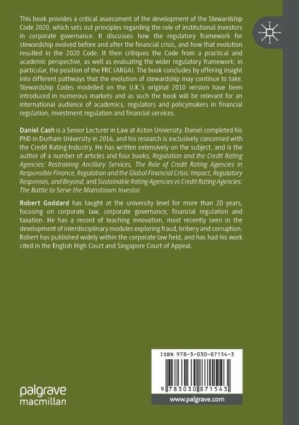 This book provides a critical assessment of the development of the Stewardship Code 2020, which sets out principles regarding the role of institutional investors in corporate governance. It discusses how the regulatory framework for stewardship evolved before and after the financial crisis, and how that evolution resulted in the 2020 Code. It then critiques the Code from a practical and academic perspective, as well as evaluating the wider regulatory framework; in particular, the position of the FRC (ARGA). The book concludes by offering insight into different pathways that the evolution of stewardship may continue to take. Stewardship Codes modelled on the U.K.'s original 2010 version have been introduced in numerous markets and as such the book will be relevant for an international audience of academics, regulators and policymakers in financial regulation, investment regulation and financial services.
