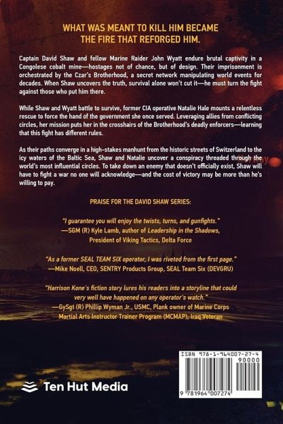 What was meant to kill him became the fire that reforged him. Captain David Shaw and fellow Marine Raider John Wyatt endure brutal captivity in a Congolese cobalt mine-hostages not of chance, but of design. Their imprisonment is orchestrated by the Czar's Brotherhood, a secret network manipulating world events for decades. When Shaw uncovers the truth, survival alone won't cut it-he must turn the fight against those who put him there. While Shaw and Wyatt battle to survive, former CIA operative Natalie Hale mounts a relentless rescue to force the hand of the government she once served. Leveraging allies from conflicting circles, her mission puts her in the crosshairs of the Brotherhood's deadly enforcers-learning that this fight has different rules. As their paths converge in a high-stakes manhunt from the historic streets of Switzerland to the icy waters of the Baltic Sea, Shaw and Natalie uncover a conspiracy threaded through the world's most influential circles. To take down an enemy that doesn't officially exist, Shaw will have to fight a war no one will acknowledge-and the cost of victory may be more than he's willing to pay. In this pulse-pounding, globe-trotting third installment of Harrison Kone's acclaimed David Shaw series, loyalties shatter, allegiances shift, and survival is anything but guaranteed. ______________ Praise for The David Shaw series: "I guarantee you will enjoy the twists, turns, and gunfights." -SGM (R) Kyle Lamb, author of Leadership in the Shadows, President of Viking Tactics, Delta Force "...authentic, accurate, gritty, and relevant." -LTG (R) Joe Anderson, Deputy Chief of Staff of the Army, Airborne Corps Commander, Air Assault Brigade Commander, Airborne Battalion Commander, Ranger Company Commander "As a former SEAL TEAM SIX operator, I was riveted from the first page." -Mike Noell, CEO, SENTRY Products Group, SEAL Team Six (DEVGRU) "Harrison Kone's fiction story lures his readers into a storyline that could very well have happened on any operator's watch." -GySgt (R) Phillip Wyman Jr., USMC, Plank owner of Marine Corps Martial Arts Instructor Trainer Program (MCMAP), Iraq Veteran