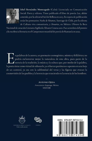 En palabras de la autora, un poemario cosmogónico, místico y folklórico; no podría esclarecerse mejor la naturaleza de esta obra, pues parte de la esencia de la tradición, la música y la cultura que, por medio de la palabra, la poeta tiene como virtud de esbozarle; ya si fueran partituras o apuntes en una hoja de un cantoral, ya sea con la sublimidad del verso y las figuras que evocan la cosmovisión de los pueblos y la herencia que trasciende en la esencia de los hombres. -- Antonio Ojeda