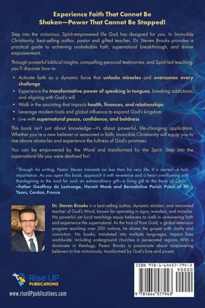 Experience Faith That Cannot Be Shaken-Power That Cannot Be Stopped! Step into the victorious, Spirit-empowered life God has designed for you. In Invincible Christianity, best-selling author, pastor and gifted teacher, Dr. Steven Brooks provides a practical guide to achieving unshakable faith, supernatural breakthrough, and divine empowerment. Through powerful biblical insights, compelling personal testimonies, and Spirit-led teaching, you'll discover how to: Activate faith as a dynamic force that unlocks miracles and overcomes every challenge Experience the transformative power of speaking in tongues, breaking addictions, and aligning with God's will Walk in the anointing that impacts health, finances, and relationships Leverage modern tools and global influence to expand God's kingdom Live with supernatural peace, confidence, and boldness This book isn't just about knowledge-it's about powerful, life-changing application. Whether you're a new believer or seasoned in faith, Invincible Christianity will equip you to rise above obstacles and experience the fullness of God's promises. You can be empowered by the Word and transformed by the Spirit. Step into the supernatural life you were destined for! What Leading Theologians Are Saying: "Through his writing, Pastor Steven transmits no less than his very life. It is sacred-a holy impartation. As you open this book, approach it with reverence and a heart overflowing with thanksgiving to the Lord for such an extraordinary gift-a living gift to the body of Christ." ~Father Geoffroy de Lestrange, Benedictine Parish Priest of 40 Years and Hermit Monk, Cerdon, France "This powerful volume is victory-based living made clear and simple. With scriptural authority and spiritual insight, believers will be speaking out their destiny to the amazement of this dark world. For those in my tradition, Pastor Steven embodies the spirit of St. Padre Pio, whose gifts have inspired us for decades. How lovely that God is uniting us all in fidelity, faith, and power!" ~Rev. Dr. Ronald Thomas, Ph.D. University of Cambridge in England, Associate Professor, Canonical Mandatum from the Diocese of Charlotte, Theology Dr. Steven Brooks is a best-selling author, dynamic minister, and renowned teacher of God's Word, known for operating in signs, wonders, and miracles. His powerful yet lucid teachings equip believers to walk in unwavering faith and experience the supernatural. As the host of Pure Gold, a global television program reaching over 200 nations, he shares the gospel with clarity and conviction. His books, translated into multiple languages, impact lives worldwide, including underground churches in persecuted regions. With a doctorate in theology, Pastor Brooks is passionate about empowering believers to live victoriously, transformed by God's love and power.