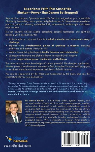 Experience Faith That Cannot Be Shaken-Power That Cannot Be Stopped! Step into the victorious, Spirit-empowered life God has designed for you. In Invincible Christianity, best-selling author, pastor and gifted teacher, Dr. Steven Brooks provides a practical guide to achieving unshakable faith, supernatural breakthrough, and divine empowerment. Through powerful biblical insights, compelling personal testimonies, and Spirit-led teaching, you'll discover how to: Activate faith as a dynamic force that unlocks miracles and overcomes every challenge Experience the transformative power of speaking in tongues, breaking addictions, and aligning with God's will Walk in the anointing that impacts health, finances, and relationships Leverage modern tools and global influence to expand God's kingdom Live with supernatural peace, confidence, and boldness This book isn't just about knowledge-it's about powerful, life-changing application. Whether you're a new believer or seasoned in faith, Invincible Christianity will equip you to rise above obstacles and experience the fullness of God's promises. You can be empowered by the Word and transformed by the Spirit. Step into the supernatural life you were destined for! What Leading Theologians Are Saying: "Through his writing, Pastor Steven transmits no less than his very life. It is sacred-a holy impartation. As you open this book, approach it with reverence and a heart overflowing with thanksgiving to the Lord for such an extraordinary gift-a living gift to the body of Christ." ~Father Geoffroy de Lestrange, Benedictine Parish Priest of 40 Years and Hermit Monk, Cerdon, France "This powerful volume is victory-based living made clear and simple. With scriptural authority and spiritual insight, believers will be speaking out their destiny to the amazement of this dark world. For those in my tradition, Pastor Steven embodies the spirit of St. Padre Pio, whose gifts have inspired us for decades. How lovely that God is uniting us all in fidelity, faith, and power!" ~Rev. Dr. Ronald Thomas, Ph.D. University of Cambridge in England, Associate Professor, Canonical Mandatum from the Diocese of Charlotte, Theology Dr. Steven Brooks is a best-selling author, dynamic minister, and renowned teacher of God's Word, known for operating in signs, wonders, and miracles. His powerful yet lucid teachings equip believers to walk in unwavering faith and experience the supernatural. As the host of Pure Gold, a global television program reaching over 200 nations, he shares the gospel with clarity and conviction. His books, translated into multiple languages, impact lives worldwide, including underground churches in persecuted regions. With a doctorate in theology, Pastor Brooks is passionate about empowering believers to live victoriously, transformed by God's love and power.