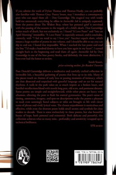 Invincible Ink is a 128-page tribute to love by Canadian poet Don Gutteridge. It has been said that if you admire the work of Dylan Thomas such as "Do not go gentle in that good night", and Tomas Hardy's "The Darkling Thrush", you are probably going to love the fine work by Gutteridge. Poetry lovers, should be introduced to this contemporary poet who can equal the best of contemporary poetry, but whose work has the advantage of being more succinct than Grey's. Gutteridge's magical way with words will hold the reader entranced; everything he offers in "Invincible Ink" is uniquely expressed, from the poems about The Widow Bray, where her personal grief is entwined with the passing of the seasons to the tragedy of a child's death. Don Gutteridge writes much of death, but not exclusively so. I found "A Love Poem" and "Into an April Morning" irresistible; "A Love Poem" is especially sensual, and it concludes, correctly, with "I feel no need to say I love you". Succinct equals short, which means a huge number of poems in one volume, and I should be able to say you can dip in and out. I found that impossible. When I reached the last poem and read the line "I'd trade a hundred dawns to have you here again in my heart", I turned straight back to the beginning and read them all again. Invincible Ink by Don Gutteridge is one of the best poetry books, and definitely, the most distinctive, that you will ever have the privilege of reading. It is a must read.