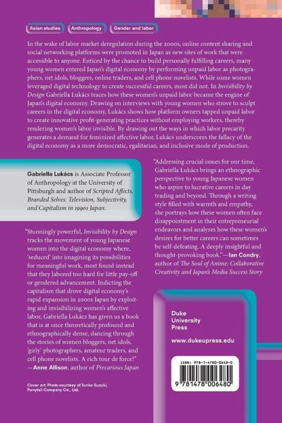 In the wake of labor market deregulation during the 2000s, online content sharing and social networking platforms were promoted in Japan as new sites of work that were accessible to anyone. Enticed by the chance to build personally fulfilling careers, many young women entered Japan's digital economy by performing unpaid labor as photographers, net idols, bloggers, online traders, and cell phone novelists. While some women leveraged digital technology to create successful careers, most did not. In Invisibility by Design Gabriella Lukács traces how these women's unpaid labor became the engine of Japan's digital economy. Drawing on interviews with young women who strove to sculpt careers in the digital economy, Lukács shows how platform owners tapped unpaid labor to create innovative profit-generating practices without employing workers, thereby rendering women's labor invisible. By drawing out the ways in which labor precarity generates a demand for feminized affective labor, Lukács underscores the fallacy of the digital economy as a more democratic, egalitarian, and inclusive mode of production.