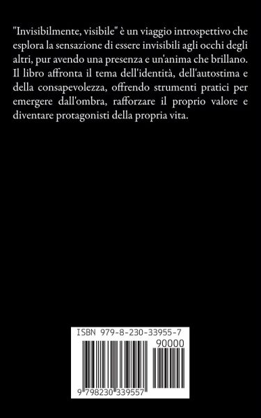 "Invisibilmente, visibile" è un viaggio introspettivo che esplora la sensazione di essere invisibili agli occhi degli altri, pur avendo una presenza e un'anima che brillano. Il libro affronta il tema dell'identità, dell'autostima e della consapevolezza, offrendo strumenti pratici per emergere dall'ombra, rafforzare il proprio valore e diventare protagonisti della propria vita.