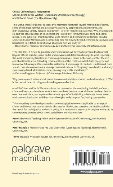 "The idea that, if we are to properly understand crime, we have to be prepared to look well beyond official statutes, penal codes and conventional definitions belongs to what is perhaps the most stimulating tradition in criminological analysis. Edwin Sutherland, conflict theorists and abolitionists are outstanding representatives of this tradition, which finds energetic and innovative following in this remarkable collection. A wide range of conducts is addressed, from sexual crimes to environmental damage, from elder abuse to bio-piracy, from health and safety violations to fraud: all invisible crimes causing very visible social harm." - Vincenzo Ruggiero, Middlesex University, UK