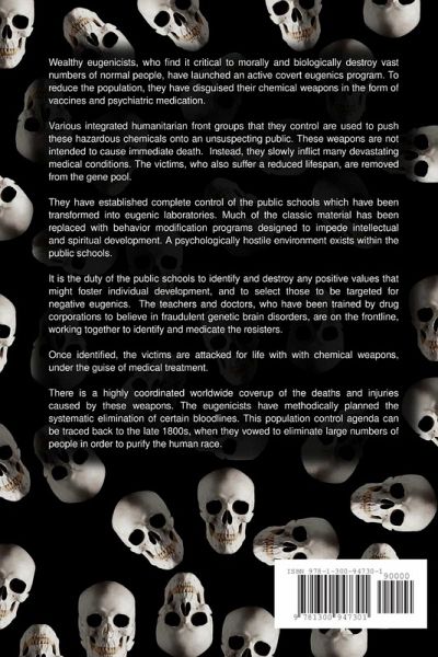 Wealthy eugenicists have launched a covert eugenics program to reduce the population. They are attacking citizens with chemical weapons disguised as medicine. These weapons slowly inflict many devastating medical conditions. The victims suffer a reduced lifespan and are removed from the breeding pool. They have established complete control of the public schools which have been transformed into eugenic laboratories. These laboratories are used to identify and destroy any positive values that might foster individual development and to identify those to be attacked. The teachers and doctors are on the frontline working together to identify the resisters, who are attacked for life with with chemical weapons, under the guise of medical treatment. There is a highly coordinated worldwide coverup of the deaths and injuries caused by these weapons. This population control agenda can be traced back to the late 1800s, when they vowed to eliminate certain bloodlines in order to purify the human race.