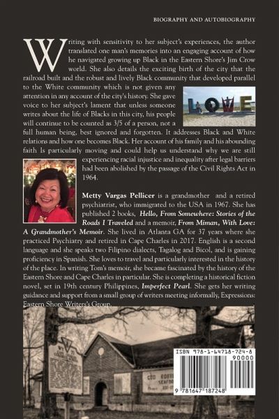 The book is a memoir about growing up Black in Cape Charles, Virginia on the Eastern Shore of the Chesapeake. It details the origin of the town as a railroad terminus and connecting to ferry barges across the Chesapeake Bay to Norfolk, through its golden age in the Jim Crow South and its decline with the ascendancy of automobiles and the building of the Chesapeake Bay Bridge-Tunnel. Its rise again as a tourist destination in the past decade and how the fortunes of the town is chronicled, without acknowledgment of the role of the Black community, which was a robust and thriving parallel community, that evolved in response to the segregation of the Jim Crow South. Now the town is rising again as a tourist destination and replacing the Black section with White weekend second home owners, and the Black presence has considerably diminished. Without a recording of its history, its entire memory will be gone, as if it was never there at all. The memoir details the life of one Black man who is the grandson of a slave but became the first elected Black member of the Town Council and the first Black member elected to the Northampton County Board of Supervisors. It addresses Black and White relations and the experience of being Black and how one navigates the Jim Crow racist era. By reading this account of a Black man's life one may develop a better understanding of why we are still experiencing racial injustice and inequality, after legal barriers had been abolished by the passage of the Civil Rights Act in 1964. Its target audience would be all who are interested, both Blacks and Whites, in learning how they still carry the legacy of slavery in their hearts and how it informs their behavior at present and how by acknowledging their racist beliefs, they can choose to correct them, with actions that help realize the dream of true equality of the races and fulfill the lofty promise of the Revolution: its declaration of the self- evident truth, that all men are created equal, with unalienable rights to Life, Liberty, and the pursuit of Happiness.