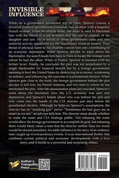 While on a government-sponsored trip to Paris, Spencer Graves, a divorced midlevel government economist, has an affair with a beautiful French woman. When he returns home, the affair is used to blackmail him with the threat of a jail sentence and the loss of custody of his daughter and son. He is forced to break government rules and into unlawful activity apparently for the blackmailer financial benefit. Then the threat of physical harm to his children coerces him into contributing to an economic depression. When Spencer decides to track down the blackmailer, his search leads him back to Paris to locate the woman with whom he had the affair. While in France, Spencer is reunited with his former lover. Finally, he concludes the plot was not perpetrated by a single blackmailer for financial benefit but by a foreign government meaning to hurt the United States by destroying its economy, weakening its military, and influencing the outcome of a presidential election. When Spencer gets close to the truth, the foreign government behind the plot decides to kill him, his French mistress, and two men to whom he has mentioned the plot. After the assassination plans are executed, Spencer's notes about the blackmail, how the U.S. economy was sent into depression, and Spencer's beliefs about who was behind the plot and why come into the hands of the CIA director just days before the presidential election. Although he believes Spencer's assumptions, the director has no "smoking gun" prove. "Sometimes the bad guys are as smart as we are," an advisor tells him. The director must decide whether to make the notes and CIA findings public. Not releasing the notes would allow the foreign government to accomplish its goal, but releasing them would likely mean a man that the director neither likes nor trusts would be elected president. Invisible Influence is the story of an ordinary man caught up in extraordinary events. It is an international thriller that combines current political and economic developments with a love story, and it builds to a powerful and surprising climax.