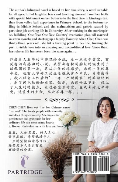 The author's bilingual novel is based on her true story, A novel suitable for all ages, full of laughter, tears and touching moment. From her birth with special birthmark on her buttocks to the first time in kindergarten, then from volley ball experience in Primary School, to the fortune telling in Middle School, and the malnutrition and gastric caused by part-time job working life in University. After working in the marketplace, fulfilling 'One Year One New Country' recreation plan till married in seven months and starting up a family. However, when Chen Chen was thirty-three years old, she hit a turning point in her life, turning the past invisible love into an amazing and unconditional love. Since then, her reborn life has never been the same again. . . ''