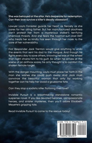 She was betrayed at the altar. He's desperate for redemption. Can their love survive a killer's deadly obsession? Lawyer Layla Forrester guards her heart as fiercely as she cares for her ailing father. But her manufactured aloofness can't protect her from a mysterious stalker's terrifying chemical threats. And she fears the hazmat-suit-clad EMT who treats her so kindly has seen through her mask to the core of her vulnerability. First Responder Jack Trenton would give anything to undo the events that sent his dad to the morgue. And though he fights every day to save others, knowing he was at the wheel that night chains him to his guilt. So when he arrives at the scene of an anthrax scare, his only thought is to comfort the shaken female target. With the danger mounting, Layla must place her faith in the man she wishes she could push away. And Jack must convince the beautiful woman that only by working together can he help her avoid a gruesome fate. Can they stop a sadistic killer flatlining their love? Invisible Pursuit is a breathtaking standalone romantic suspense novel. If you like devoted heroines, compassionate heroes, and sinister mysteries, then you'll adore Elizabeth Meyette's gripping tale. Buy Invisible Pursuit to come to the rescue today!