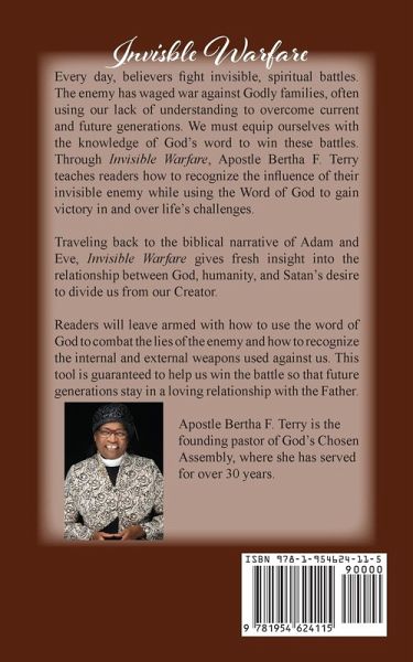 Every day, believers fight invisible, spiritual battles. The enemy has waged war against Godly families, often using our lack of understanding to overcome current and future generations. We must equip ourselves with the knowledge of God's word to win these battles. Through Invisible Warfare, Apostle Bertha F. Terry teaches readers how to recognize the influence of their invisible enemy while using the Word of God to gain victory in and over life's challenges. Traveling back to the biblical narrative of Adam and Eve, Invisible Warfare gives fresh insight into the relationship between God, humanity, and Satan's desire to divide us from our Creator. Readers will leave armed with how to use the word of God to combat the lies of the enemy, recognize the internal and external weapons used against us, build strong, godly families that follow God's ordered plan, know the voice of the God amid chaos, and grow in our spiritual walk--tool guaranteed to help us win the battle so that future generations stay in a loving relationship with the Father. This book is essential for anyone seeking to live the life God intended for them! Apostle Bertha F. Terry is the founding pastor of God's Chosen Assembly, where she has served for over 30 years.