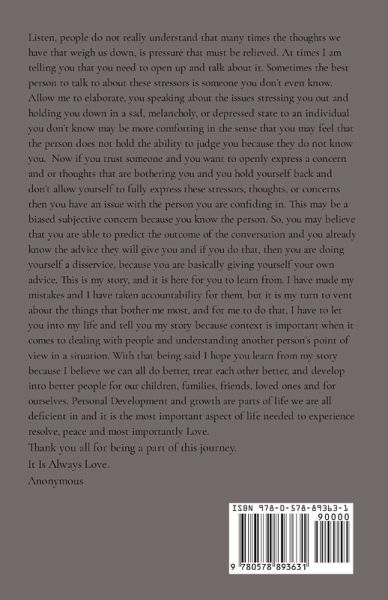 In a day and age where we are all running away from our own pain and stressors, it is time we all begin our journey for Self-Development and Personal Growth together. This journey you will go through reading Invisible Wounds, will take you down a path of isolation, emotional pain, anguish, disappointment, frustration, depression, and heartbreak. At the end of Invisible Wounds, that path we went down together will lead you to become a better person, parent, relative, friend, significant other, by teaching you first how to take accountability for your actions and mistakes, then teaching you about Self Development and Personal Growth Techniques and finally learning how to forgive and reach a state of peace and resolve. Invisible Wounds is the captivating memoir of an Anonymous man and his path to find peace and resolve in his life. Through brutal honesty and deep emotional sentiments Invisible Wounds gives you the mindset and thought process of an adolescent man who had no guidance and made many mistakes who then transforms into an adult mature man with what seemed to be impenetrable morals until his soul was broken. Invisible Wounds is also the story of a young man venturing life's trenches with the belief that love could overpower societies norms and this current sex culture, our society has turned into. With that being said, once Anonymous lost what was believed to be his soul mate, he realized love is still very much alive but has taken a hiatus until we as a society begin to treat one another with honesty, dignity, respect, and begin to be genuine with our emotions and intentions. In rich and intimate detail Invisible Wounds delivers a powerful message of love, strength, and perseverance. The lone journey of Anonymous attempting to fill a void to a man who currently is at peace is a groundbreaking story needed to be heard by all. This breathtaking, heartwarming, indescribable memoir of a man attempting to reveal the existence of love is one for the ages. Invisible Wounds will resonate with its honesty, intense emotions, humility, and most importantly love.