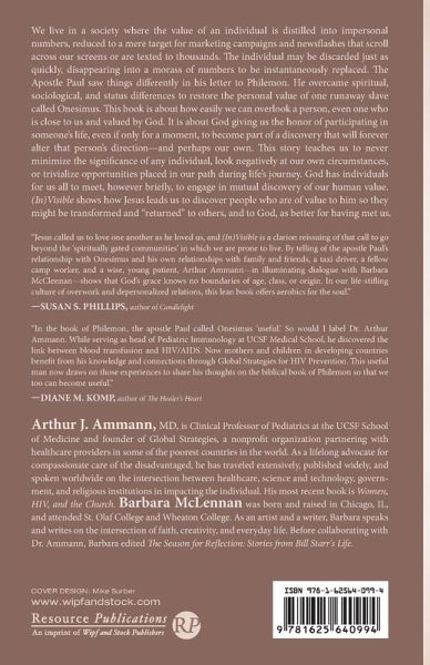 We live in a society where the value of an individual is distilled into impersonal numbers, reduced to a mere target for marketing campaigns and newsflashes that scroll across our screens or are texted to thousands. The individual may be discarded just as quickly, disappearing into a morass of numbers to be instantaneously replaced. The Apostle Paul saw things differently in his letter to Philemon. He overcame spiritual, sociological, and status differences to restore the personal value of one runaway slave called Onesimus. This book is about how easily we can overlook a person, even one who is close to us and valued by God. It is about God giving us the honor of participating in someone's life, even if only for a moment, to become part of a discovery that will forever alter that person's direction--and perhaps our own. This story teaches us to never minimize the significance of any individual, look negatively at our own circumstances, or trivialize opportunities placed in our path during life's journey. God has individuals for us all to meet, however briefly, to engage in mutual discovery of our human value. (In)Visible shows how Jesus leads us to discover people who are of value to him so they might be transformed and ""returned"" to others, and to God, as better for having met us. In the book of Philemon, the Apostle Paul called Onesimus 'useful.' So would I label Dr. Arthur Ammann. While serving as head of Pediatric Immunology at UCSF Medical School, he discovered the link between blood transfusion and HIV/AIDS. Now mothers and children in developing countries benefit from his knowledge and connections through Global Strategies for HIV Prevention. This useful man now draws on those experiences to share his thoughts on the biblical book of Philemon so that we too can become useful. --Diane M. Komp, author of The Healer's Heart Jesus called us to love one another as he loved us, and (In)Visible is a clarion reissuing of that call to go beyond the 'spiritually gated communities' in which we are prone to live. By telling of the Apostle Paul's relationship with Onesimus and his own relationships with family and friends, a taxi driver, a fellow camp worker, and a wise, young patient, Arthur Ammann--in illuminating dialogue with Barbara McClennan--shows that God's grace knows no boundaries of age, class, or origin. In our life-stifling culture of overwork and depersonalized relations, this lean book offers aerobics for the soul. --Susan S. Phillips, author of Candlelight Arthur J. Ammann, MD, is Clinical Professor of Pediatrics at the UCSF School of Medicine and founder of Global Strategies, a nonprofit organization partnering with healthcare providers in some of the poorest countries in the world. As a lifelong advocate for compassionate care of the disadvantaged, he has traveled extensively, published widely, and spoken worldwide on the intersection between healthcare, science and technology, government, and religious institutions in impacting the individual. His most recent book is Women, HIV, and the Church. Barbara McLennan was born and raised in Chicago, IL, and attended St. Olaf College and Wheaton College. As an artist and a writer, Barbara speaks and writes on the intersection of faith, creativity, and everyday life. Before collaborating with Dr. Ammann, Barbara edited The Season for Reflection: Stories from Bill Starr's Life.