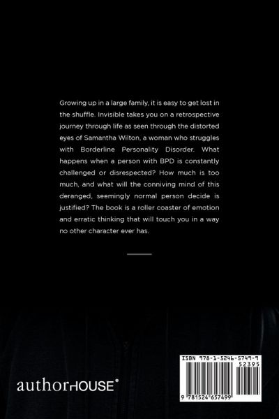 Growing up in a large family, it is easy to get lost in the shuffle. Invisible takes you on a retrospective journey through life as seen through the distorted eyes of Samantha Wilton, a woman who struggles with Borderline Personality Disorder. What happens when a person with BPD is constantly challenged or disrespected? How much is too much, and what will the conniving mind of this deranged, seemingly normal person decide is justified? The book is a roller coaster of emotion and erratic thinking that will touch you in a way no other character ever has.