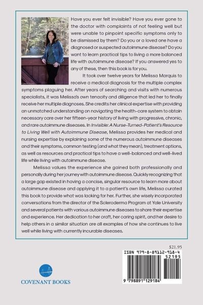 Have you ever felt invisible? Have you ever gone to the doctor with complaints of not feeling well but were unable to pinpoint specific symptoms only to be dismissed by them? Do you or a loved one have a diagnosed or suspected autoimmune disease? Do you want to learn practical tips to living a more balanced life with autoimmune disease? If you answered yes to any of these, then this book is for you. It took over twelve years for Melissa Marquis to receive a medical diagnosis for the multiple complex symptoms plaguing her. After years of searching and visits with numerous specialists, it was Melissa's own tenacity and diligence that led her to finally receive her multiple diagnoses. She credits her clinical expertise with providing an unmatched understanding on navigating the health-care system to obtain necessary care over her fifteen-year history of living with progressive, chronic, and rare autoimmune diseases. In Invisible: A Nurse-Turned-Patient's Resource to Living Well with Autoimmune Disease, Melissa provides her medical and nursing expertise by explaining some of the numerous autoimmune diseases and their symptoms, common testing (and what they mean), treatment options, as well as resources and practical tips to have a well-balanced and well-lived life while living with autoimmune disease. Melissa values the experience she gained both professionally and personally during her journey with autoimmune disease. Quickly recognizing that a large gap existed in having a concise, singular resource to learn more about autoimmune disease and applying it to a patient's own life, Melissa curated this book to provide what was lacking for her. Further, she wisely incorporated conversations from the director of the Scleroderma Program at Yale University and several patients with various autoimmune diseases to share their expertise and experience. Her dedication to her craft, her caring spirit, and her desire to help others in a similar situation are all examples of how she continues to live well while living with currently incurable diseases..