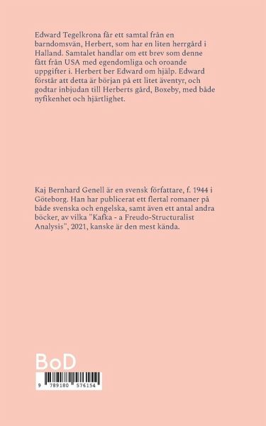 Edward Tegelkrona får ett telefonsamtal från barndomsvännen Herbert, som äger en mindre herrgård i Halland. Det handlar om ett brev som vännen Herbert fått från USA innehållande egendomliga och oroande uppgifter. Herbert ber Edward om hjälp. Edward förstår att detta är början på ett litet äventyr, när han godtar en inbjudan till Herberts gård, Boxeby, med både nyfikenhet och hjärtlighet.