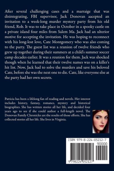 After several challenging cases and a marraige that was disintegrating, FBI supervisor, Jack Donovan aacepted an invitation to a week-long murder mystery party from his old friend, Rob. It was to take place in October in a spooky castle on a private island four miles from Salem Ma. Jack had an ulterior motive for accepting the invitation. He was hoping to reconnect with his long-lost love, Cate Montgomery who was also coming to the party. The guest list was a reunion of twelve friends who grew up together during their summers at a child's summer soccer camp decades earlier. It was a reunion for them. Jack was shocked though when he learned that their twelve names was on a killer's hit list. Now, Jack had to solve the murders and save his beloved Cate, before she was the next one to die. Cate, like everyone else at the party had her own secrets.
