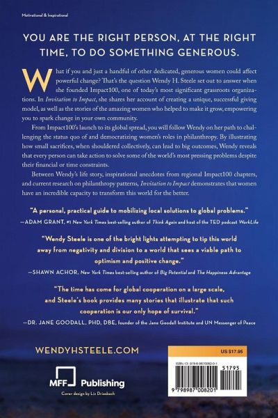 You are the right person, at the right time, to do something generous. What if you and just a handful of other dedicated, generous women could affect powerful change? That's the question Wendy H. Steele set out to answer when she founded Impact100, one of today's most significant grassroots organizations. In Invitation to Impact, she shares her story of creating a unique, successful giving model, as well as the stories of the amazing women who helped to make it grow, empowering you to spark change in your own community. From Impact100's launch to its global spread, you will follow Wendy on her path to challenging the status quo of and democratizing women's roles in philanthropy. By illustrating how small sacrifices, when shouldered collectively, can lead to big outcomes, Wendy reveals that every person can take action to solve some of the world's most pressing problems despite their financial or time constraints. Between Wendy's life story, inspirational anecdotes from regional Impact100 chapters, and current research on philanthropy patterns, Invitation to Impact demonstrates that women have an incredible capacity to transform this world for the better.