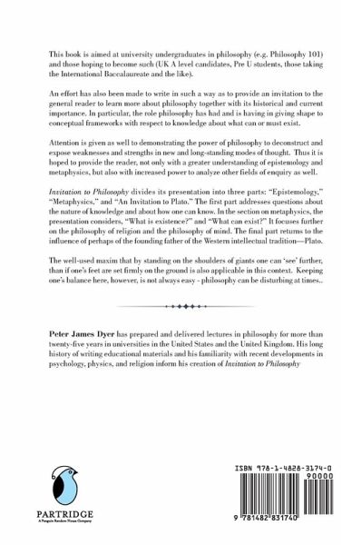 This book is aimed at university undergraduates in philosophy (e.g. Philosophy 101) and those hoping to become such (UK A level candidates, Pre U students, those taking the International Baccalaureate and the like). An effort has also been made to write in such a way as to provide an invitation to the general reader to learn more about philosophy together with its historical and current importance. In particular, the role philosophy has had and is having in giving shape to conceptual frameworks with respect to knowledge about what can or must exist. Attention is given as well to demonstrating the power of philosophy to deconstruct and expose weaknesses and strengths in new and long-standing modes of thought. Thus it is hoped to provide the reader, not only with a greater understanding of epistemology and metaphysics, but also with increased power to analyze other fields of enquiry as well. Invitation to Philosophy divides its presentation into three parts: "Epistemology," "Metaphysics," and "An Invitation to Plato." The first part addresses questions about the nature of knowledge and about how one can know. In the section on metaphysics, the presentation considers, "What is existence?" and "What can exist?" It focuses further on the philosophy of religion and the philosophy of mind. The final part returns to the influence of perhaps of the founding father of the Western intellectual tradition-Plato. The well-used maxim that by standing on the shoulders of giants one can 'see' further, than if one's feet are set firmly on the ground is also applicable in this context. Keeping one's balance here, however, is not always easy - philosophy can be disturbing at times..
