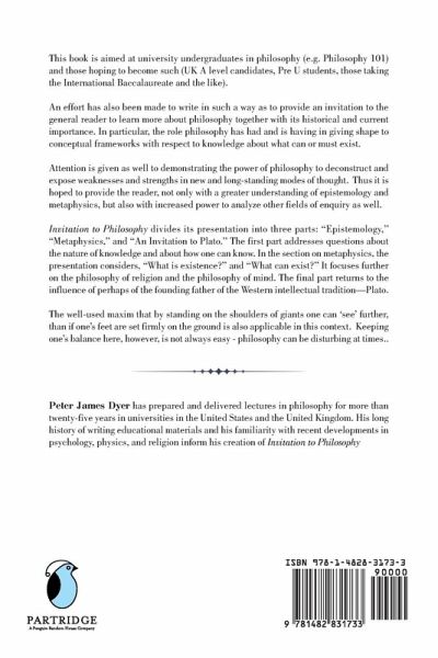 This book is aimed at university undergraduates in philosophy (e.g. Philosophy 101) and those hoping to become such (UK A level candidates, Pre U students, those taking the International Baccalaureate and the like). An effort has also been made to write in such a way as to provide an invitation to the general reader to learn more about philosophy together with its historical and current importance. In particular, the role philosophy has had and is having in giving shape to conceptual frameworks with respect to knowledge about what can or must exist. Attention is given as well to demonstrating the power of philosophy to deconstruct and expose weaknesses and strengths in new and long-standing modes of thought. Thus it is hoped to provide the reader, not only with a greater understanding of epistemology and metaphysics, but also with increased power to analyze other fields of enquiry as well. Invitation to Philosophy divides its presentation into three parts: "Epistemology," "Metaphysics," and "An Invitation to Plato." The first part addresses questions about the nature of knowledge and about how one can know. In the section on metaphysics, the presentation considers, "What is existence?" and "What can exist?" It focuses further on the philosophy of religion and the philosophy of mind. The final part returns to the influence of perhaps of the founding father of the Western intellectual tradition-Plato. The well-used maxim that by standing on the shoulders of giants one can 'see' further, than if one's feet are set firmly on the ground is also applicable in this context. Keeping one's balance here, however, is not always easy - philosophy can be disturbing at times..