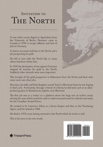 A man with a recent degree in Agriculture from the University of Berlin, Hermann came to Canada in 1930 to escape inflation and lack of jobs in Germany. A chance encounter led him to the North and a job prospecting for gold. He fell in love with the North like so many others had done before him. In 1939 the declaration of war against Germany stopped all searches for gold in the North. Suddenly other minerals were more important. This brought all the gold prospectors to Edmonton from the North and there were many more men than jobs. Hermann, his wife, and little daughter moved 'back' to Montreal where he was hoping to find a job. Fortunately, through a friend of a friend, he did land a job at an alloy-producing plant in Beauharnois, Quebec near Montreal. The first job was as a 'stoker' on a platform above the huge vats of molten metal, stirring the mass which would be used to make armoured steel for vehicles and tanks, for the Canadian Armed Forces. He worked at St. Lawrence Alloys as a Stores Keeper and then as the Purchasing Agent, until he retired in 1968. He died in 1970, never having returned to the North which he loved so well. This is his story in his own words.