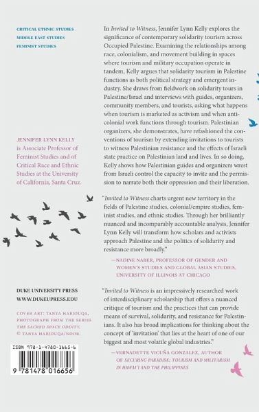 In Invited to Witness, Jennifer Lynn Kelly explores the significance of contemporary solidarity tourism across Occupied Palestine. Examining the relationships among race, colonialism, and movement-building in spaces where tourism and military occupation operate in tandem, Kelly argues that solidarity tourism in Palestine functions as both political strategy and emergent industry. She draws from fieldwork on solidarity tours in Palestine/Israel and interviews with guides, organizers, community members, and tourists, asking what happens when tourism is marketed as activism and when anticolonial work functions through tourism. Palestinian organizers, she demonstrates, have refashioned the conventions of tourism by extending invitations to tourists to witness Palestinian resistance and the effects of Israeli state practice on Palestinian land and lives. In so doing, Kelly shows how Palestinian guides and organizers wrest from Israeli control the capacity to invite and the permission to narrate both their oppression and their liberation.