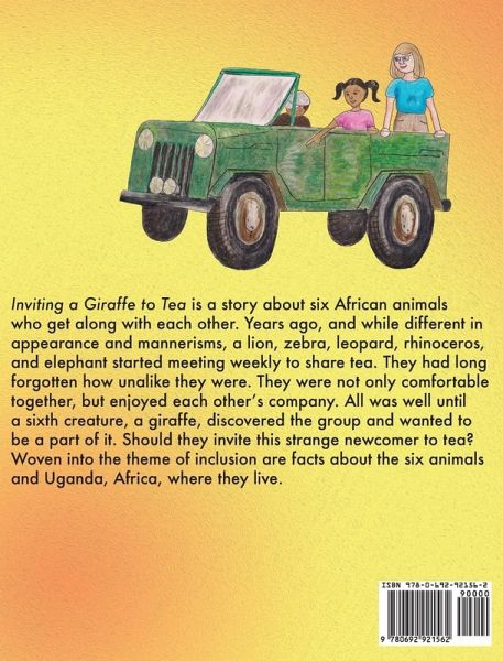 Have you ever been "too" something? Too young, too old, too short, too tall, too black, too white, too ugly, too fat, too skinny, too smart, too noisy, too quiet - just too different? We think if we surround ourselves with people just like us, we will somehow be better and, in essence, elevate and preserve ourselves. Animals do the same thing - but mostly just for preservation related to food supply and safety. They are guarded and fearful of each other's dissimilarities. But what if we removed the "too" for humans and animals? Set in Uganda, Africa, a group of five very different animals found a way to not only get along but also enjoy being together. For years, a lion, a zebra, a leopard, a rhinoceros, and an elephant met weekly to share adventures over tea. They had long forgotten their differences. All was well until the day a giraffe discovered the group, dredged up those differences and wanted to join in. Should they invite the giraffe to tea? Through words and original illustrations, this book teaches about Africa and the importance of diversity.