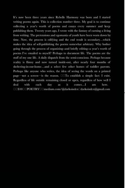 Involuntary Astronauts is a collection of poems and essays written between August, 2019 and July 2020. The work deals with a set of recurring themes: the life of parenting a toddler, identity, anxiety, illness, disconnection, wonder and love. It's now been three years since Rebelle Harmony was born and I started writing poems again. This is collection number three. My goal is to continue collecting a year's worth of poems and essays every summer and keep publishing them. Twenty years ago, I wrote with the fantasy of earning a living from writing. The pretensions and egomania of youth have been worn down by time. Now, the process is edifying and the end result is secondary...which makes the idea of self-publishing the poems somewhat arbitrary. Why bother going through the process of organizing--and briefly editing--a year's worth of poems I've emailed to myself? Perhaps to document life. The poems are the stuff of my one life. A daily dispatch from the semi-conscious. Perhaps because reality is flimsy and now turned inside-out, after nearly four months of sheltering-in-our-home...and a select few other homes of toddler parents. Perhaps like anyone who writes, the idea of seeing the words on a printed page-not a screen-is the reason. To establish a simple fact: I exist. Natasha and I exist. Rebelle Harmony exists. Regardless of what is closed or open, regardless of how we deal with each day as it comes...we are here.