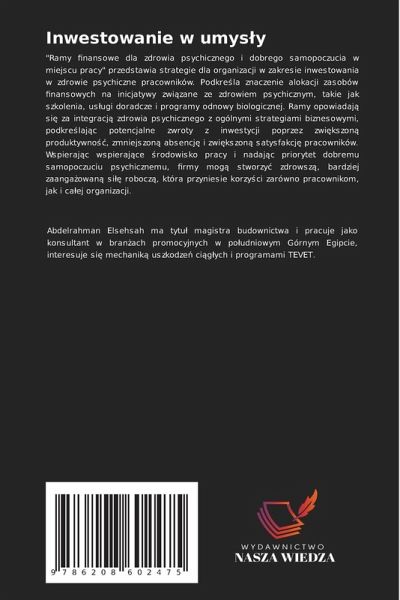 "Ramy finansowe dla zdrowia psychicznego i dobrego samopoczucia w miejscu pracy" przedstawia strategie dla organizacji w zakresie inwestowania w zdrowie psychiczne pracowników. Podkre¿la znaczenie alokacji zasobów finansowych na inicjatywy zwi¿zane ze zdrowiem psychicznym, takie jak szkolenia, us¿ugi doradcze i programy odnowy biologicznej. Ramy opowiadaj¿ si¿ za integracj¿ zdrowia psychicznego z ogólnymi strategiami biznesowymi, podkre¿laj¿c potencjalne zwroty z inwestycji poprzez zwi¿kszon¿ produktywno¿¿, zmniejszon¿ absencj¿ i zwi¿kszon¿ satysfakcj¿ pracowników. Wspieraj¿c wspieraj¿ce ¿rodowisko pracy i nadaj¿c priorytet dobremu samopoczuciu psychicznemu, firmy mog¿ stworzy¿ zdrowsz¿, bardziej zaangäowan¿ si¿¿ robocz¿, która przyniesie korzy¿ci zarówno pracownikom, jak i cäej organizacji.