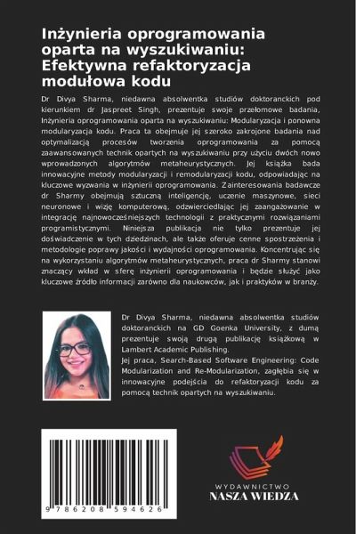 Dr Divya Sharma, niedawna absolwentka studiów doktoranckich pod kierunkiem dr Jaspreet Singh, prezentuje swoje prze¿omowe badania, In¿ynieria oprogramowania oparta na wyszukiwaniu: Modularyzacja i ponowna modularyzacja kodu. Praca ta obejmuje jej szeroko zakrojone badania nad optymalizacj¿ procesów tworzenia oprogramowania za pomoc¿ zaawansowanych technik opartych na wyszukiwaniu przy u¿yciu dwóch nowo wprowadzonych algorytmów metaheurystycznych. Jej ksi¿¿ka bada innowacyjne metody modularyzacji i remodularyzacji kodu, odpowiadaj¿c na kluczowe wyzwania w in¿ynierii oprogramowania. Zainteresowania badawcze dr Sharmy obejmuj¿ sztuczn¿ inteligencj¿, uczenie maszynowe, sieci neuronowe i wizj¿ komputerow¿, odzwierciedlaj¿c jej zaangäowanie w integracj¿ najnowocze¿niejszych technologii z praktycznymi rozwi¿zaniami programistycznymi. Niniejsza publikacja nie tylko prezentuje jej do¿wiadczenie w tych dziedzinach, ale tak¿e oferuje cenne spostrze¿enia i metodologie poprawy jako¿ci i wydajno¿ci oprogramowania. Koncentruj¿c si¿ na wykorzystaniu algorytmów metaheurystycznych, praca dr Sharmy stanowi znacz¿cy wk¿ad w sfer¿ in¿ynierii oprogramowania i b¿dzie s¿u¿y¿ jako kluczowe ¿ród¿o informacji zarówno dla naukowców, jak i praktyków w bran¿y.