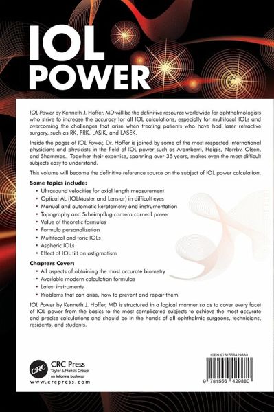 IOL Power by Kenneth J. Hoffer, MD will be the definitive resource worldwide for ophthalmologists who strive to increase the accuracy for all IOL calculations,especially for multifocal IOLs and overcoming the challenges that arise when treating patients that have had laser refractive surgery, such as RK, PRK, LASIK, and LASEK.