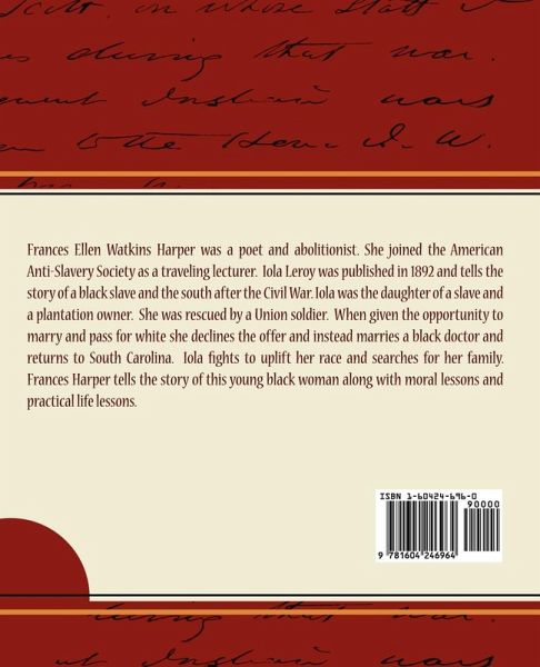 Frances Ellen Watkins Harper was a poet and abolitionist. She joined the American Anti-Slavery Society as a traveling lecturer. Iola Leroy was published in 1892 and tells the story of a black slave and the south after the Civil War. Iola was the daughter of a slave and a plantation owner. She was rescued by a Union soldier. When given the opportunity to marry and pass for white she declines the offer and instead marries a black doctor and returns to South Carolina. Iola fights to uplift her race and searches for her family. Frances Harper tells the story of this young black woman along with moral lessons and practical life lessons.