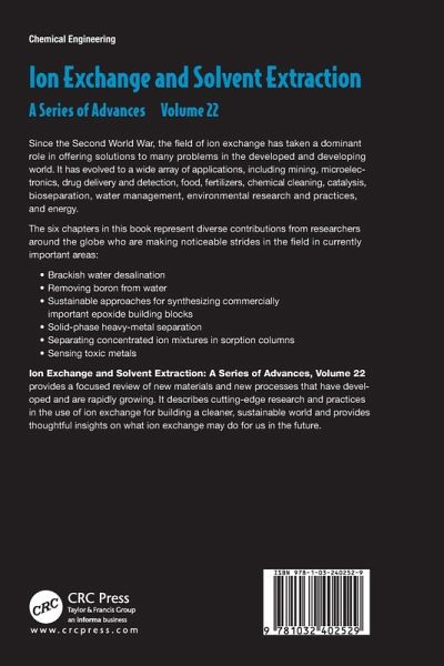 Since the Second World War, the field of ion exchange has taken a dominant role in offering solutions to many problems in the developed and developing world. It has evolved to a wide array of applications, including mining, microelectronics, drug delivery and detection, food, fertilizers, chemical cleaning, catalysis, bioseparation, water management, environmental research and practices, and energy. The six chapters in this book represent diverse contributions from researchers around the globe who are making noticeable strides in the field in currently important areas:Brackish water desalination Removing boron from water Sustainable approaches for synthesizing commercially important epoxide building blocks Solid-phase heavy-metal separation Separating concentrated ion mixtures in sorption columns Sensing toxic metals Ion Exchange and Solvent Extraction: A Series of Advances, Volume 22 provides a focused review of new materials and new processes that have developed and are rapidly growing. It describes cutting-edge research and practices in the use of ion exchange for building a cleaner, sustainable world and provides thoughtful insights on what ion exchange may do for us in the future.