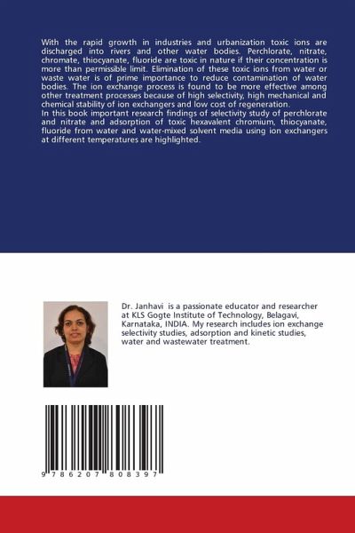 With the rapid growth in industries and urbanization toxic ions are discharged into rivers and other water bodies. Perchlorate, nitrate, chromate, thiocyanate, fluoride are toxic in nature if their concentration is more than permissible limit. Elimination of these toxic ions from water or waste water is of prime importance to reduce contamination of water bodies. The ion exchange process is found to be more effective among other treatment processes because of high selectivity, high mechanical and chemical stability of ion exchangers and low cost of regeneration. In this book important research findings of selectivity study of perchlorate and nitrate and adsorption of toxic hexavalent chromium, thiocyanate, fluoride from water and water-mixed solvent media using ion exchangers at different temperatures are highlighted.