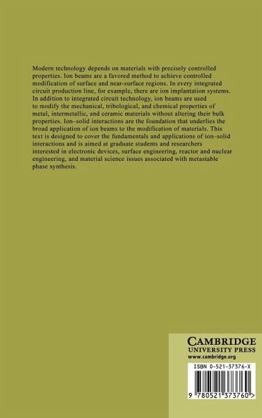Modern technology depends on materials with precisely controlled properties. Ion beams are a favoured method to achieve controlled modification of surface and near-surface regions. In every integrated circuit production line, for example, there are ion implantation systems. In addition to integrated circuit technology, ion beams are used to modify the mechanical, tribological and chemical properties of metal, intermetallic and ceramic materials without altering their bulk properties. Ion-solid interactions are the foundation that underlies the broad application of ion beams to the modification of materials. This text is designed to cover the fundamentals and applications of ion-solid interactions and is aimed at graduate students and researchers interested in electronic devices, surface engineering, reactor and nuclear engineering and material science issues associated with metastable phase synthesis.