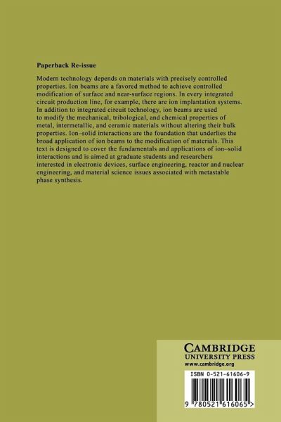 Modern technology depends on materials with precisely controlled properties. Ion beams are a favoured method to achieve controlled modification of surface and near-surface regions. In every integrated circuit production line, for example, there are ion implantation systems. In addition to integrated circuit technology, ion beams are used to modify the mechanical, tribological and chemical properties of metal, intermetallic and ceramic materials without altering their bulk properties. Ion-solid interactions are the foundation that underlies the broad application of ion beams to the modification of materials. This text is designed to cover the fundamentals and applications of ion-solid interactions and is aimed at graduate students and researchers interested in electronic devices, surface engineering, reactor and nuclear engineering and material science issues associated with metastable phase synthesis.