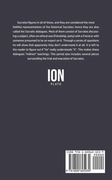 Do you want to read ION? If so then keep reading... Socrates figures in all of these, and they are considered the most faithful representations of the historical Socrates; hence they are also called the Socratic dialogues. Most of them consist of Socrates discussing a subject, often an ethical one (friendship, piety) with a friend or with someone presumed to be an expert on it. Through a series of questions he will show that apparently they don't understand it at all. It is left to the reader to figure out if "he" really understands "it". This makes these dialogues "indirect" teachings. This…mehr
