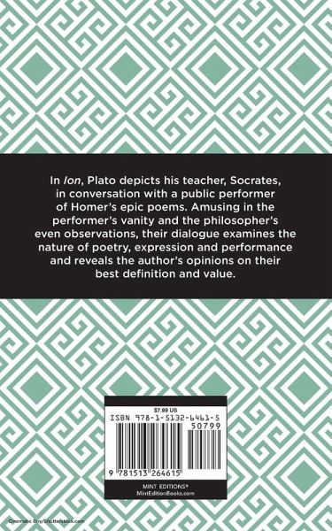 An award-winning public reader of Homer discusses poetry and the nature of performance with the probing and insightful Socrates in Plato's immortal dialogue. Ion, a professional rhapsode, performer of dramatic recitations of Homer and lecturer on poetry, has a revealing discussion with Socrates. Acclaimed for the power of his performances, Ion becomes so involved in performing that he feels the emotions described in his story and expects them to be transmitted to his audience, inspiring laughter or tears. More than this, Ion claims his understanding of Homer is second to none. Socrates offers a chain of subtly wily questions that cause much reconsideration of the nature of poets, poetry and artistic interpretation. The even, ironic tone of the philosopher makes a sharp and amusing contrast with Ion's pride and energy in this elegant example of Plato's penetrating thought. With an eye-catching new cover, and professionally typeset manuscript, this edition of Ion is both modern and readable. Since our inception in 2020, Mint Editions has kept sustainability and innovation at the forefront of our mission. Each and every Mint Edition title gets a fresh, professionally typeset manuscript and a dazzling new cover, all while maintaining the integrity of the original book. With thousands of titles in our collection, we aim to spotlight diverse public domain works to help them find modern audiences. Mint Editions celebrates a breadth of literary works, curated from both canonical and overlooked classics from writers around the globe.