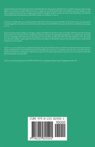 Age play had been Ione's dirty little secret for her whole life. She knew that people would think she was weird for dressing as a baby, wearing diapers, and sucking on a pacifier. When Ione went to college, she met her best friend Jade, who stumbled onto Ione's pacifiers one day. After a long conversation that Ione thought would send Jade running for the hills, it turned out that her best friend knew a lot about the world of kink. Jade introduced Ione to club KINK, and the rest was history. Or was it? Lennon was a Daddy; there was no question about it. He loved to nurture and care for the littles. He loved the innocent way they played. Lennon longed for a little of his own, so when he is asked to help out at Club KINK with a party for the littles, he definitely isn't going to reject it. Tanya was a busy woman working as an emergency surgeon; she didn't have the time to focus on the other side of her personality. The side that loved her role as Mommy. It was something she wanted to change. It was getting lonely going home to an empty house. She hadn't been in a relationship with a little for years, her work got in the way of her love life, and in the end, Carlos decided to end it. He needed more than she could give. Tanya and her best friend Aina were members at Club KINK, and now that Aina had her mates, it made Tanya's loneliness even more evident. Austen was a cautious little. He was terrified of his desires. His parents had thrown him out of the house when they discovered his stash of diapers and baby powder. They'd called him the most horrendous names. But there was nothing wrong with what Austen liked. But how could he feel bad about something that made him feel so good. Now he had the opportunity to move to a new town, and join a club where like minded people surrounded him. This is a reverse harem age-play story with FF and MM scenes. Language and themes may be triggering. Suited to 18+