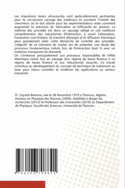 Les impulsions lasers ultracourtes sont particulièrement pertinentes pour le micro/nano usinage des matériaux et suscitent l'intérêt des chercheurs où le but ultime pour les expérimentateurs reste comment augmenter la précision de fabrication et l'efficacité du produit. La maîtrise des procédés est donc un passage obligé et une meilleure compréhension des mécanismes d'interaction, à savoir l'absorption, l'ionisation non-linéaire, le transfert d'énergie et la diffusion thermique peut grandement aider cette démarche de contrôle des procédés. L'objectif de ce mémoire de master est de présenter une étude des processus fondamentaux induits lors de l'interaction laser fs avec un matériau transparent (le diamant).On s'intéresse principalement aux processus responsables de l'effet thermique induit lors du passage d'un régime de basse fluence à un régime de haute fluence et aux mécanismes associés. Ce travail contribue au développement du concept de technique de traitement au laser pour mieux contrôler et améliorer les applications au secteur industriel.