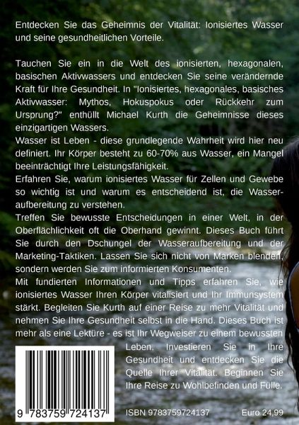 Entdecken Sie die Quelle der Vitalität: Ionisiertes Wasser und sein Potenzial für Ihre GesundheitTauchen Sie ein in die faszinierende Welt des ionisierten, hexagonalen, basischen Aktivwassers und entdecken Sie eine neue Dimension von Gesundheit und Wohlbefinden. Michael Kurth lädt Sie in seinem bahnbrechenden Buch "Ionisiertes, hexagonales, basisches Aktivwasser: Mythos, Hokuspokus oder Rückkehr zum Ursprung?" ein, die Geheimnisse und die transformative Kraft dieses einzigartigen Wassers zu entdecken.Wasser ist Leben - dieser Grundgedanke wird in diesem Buch auf eine ganz neue Ebene gehoben. Wussten Sie, dass Ihr Körper zu 60 bis 70 Prozent aus Wasser besteht? Und dass sich schon ein geringer Flüssigkeitsmangel negativ auf die körperliche und geistige Leistungsfähigkeit auswirken kann? Michael Kurth verrät, welche wichtige Rolle ionisiertes Wasser für unsere Zellen und Gewebe spielt und warum es wichtiger denn je ist, hinter die Kulissen der Wasseraufbereitung zu blicken.In einerWelt, in der Oberflächlichkeit und Marketingtaktiken oft die Oberhand gewinnen, ist es an der Zeit, bewusste Entscheidungen zu treffen. Dieses Buch ist Ihr Wegweiser durch den Dschungel der Wasseraufbereitungsmethoden und Verkaufsversprechen. Lassen Sie sich nicht von einzelnen Marken oder Produkten beeinflussen, sondern werden Sie zum selbstbestimmten Verbraucher.Mit fundierten Informationen und praktischen Tipps erfahren Sie, wie ionisiertes Wasser Ihren Körper vitalisiert, Ihre Zellen entgiftet und Ihr Immunsystem stärkt. Begleiten Sie Michael Kurth auf einer Reise zur Wiederentdeckung von Vitalität und Gesundheit und nehmen Sie Ihre Zukunft selbst in die Hand.Dieses Buch ist mehr als eine Lektüre - es ist ein Wegweiser zu einem bewussteren und gesünderen Leben. Investieren Sie in Ihre Gesundheit und entdecken Sie die Quelle Ihrer Vitalität. Bestellen Sie noch heute Ihr Exemplar von "Ionisiertes, hexagonales, basisches Aktivwasser: Mythos, Hokuspokus oder Rückkehr zum Ursprung?" und machen Sie den ersten Schritt zu einem Leben in Fülle und Wohlbefinden.