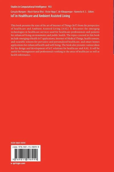 This book presents the state of the art of Internet of Things (IoT) from the perspective of healthcare and Ambient Assisted Living (AAL). It discusses the emerging technologies in healthcare services used for healthcare professionals and patients for enhanced living environments and public health. The topics covered in this book include emerging eHealth IoT applications, Internet of Medical Things, health sensors, and wearable sensors for pervasive and personalized healthcare, and smart homes applications for enhanced health and well-being. The book also presents various ideas for the design and development of IoT solutions for healthcare and AAL. It will be useful for bioengineers and professionals working in the areas of healthcare as well as health informatics.