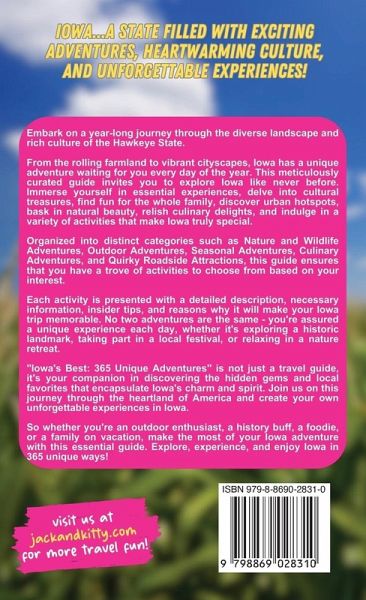 Iowa...a state filled with exciting adventures, heartwarming culture, and unforgettable experiences! Embark on a year-long journey through the diverse landscape and rich culture of the Hawkeye State with "Iowa's Best: 365 Unique Adventures - The Essential Guide to Unforgettable Experiences in the Hawkeye State (2023-2024 Edition)". From the rolling farmland to vibrant cityscapes, Iowa has a unique adventure waiting for you every day of the year. This meticulously curated guide invites you to explore Iowa like never before. Immerse yourself in essential experiences, delve into cultural treasures, find fun for the whole family, discover urban hotspots, bask in natural beauty, relish culinary delights, and indulge in a variety of activities that make Iowa truly special. Organized into distinct categories such as "Nature and Wildlife Adventures," "Outdoor Adventures," "Seasonal Adventures," "Culinary Adventures," and "Adventures at Quirky Roadside Attractions," this guide ensures that you have a trove of activities to choose from based on your interest. Also included are invaluable chapters on "Travel Basics," "Accommodation Suggestions," "Transportation," "Local Cuisine," and "Additional Resources," providing practical information to help you plan your journey more effectively. Each activity is presented with a detailed description, necessary information, insider tips, and reasons why it will make your Iowa trip memorable. No two adventures are the same - you're assured a unique experience each day, whether it's exploring a historic landmark, taking part in a local festival, or relaxing in a nature retreat. "Iowa's Best: 365 Unique Adventures" is not just a travel guide, it's your companion in discovering the hidden gems and local favorites that encapsulate Iowa's charm and spirit. Join us on this journey through the heartland of America and create your own unforgettable experiences in Iowa. So whether you're an outdoor enthusiast, a history buff, a foodie, or a family on vacation, make the most of your Iowa adventure with this essential guide. Explore, experience, and enjoy Iowa in 365 unique ways!