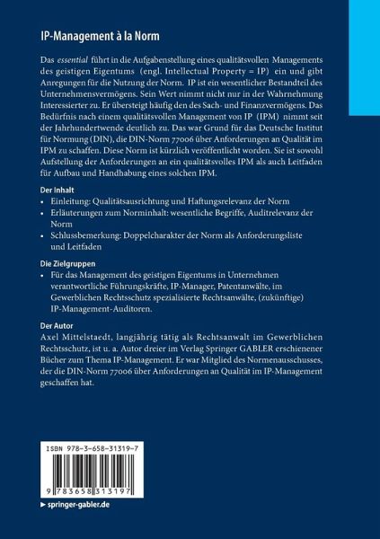Das essential führt in die Aufgabenstellung eines qualitätsvollen Managements des geistigen Eigentums (engl. Intellectual Property = IP) ein und gibt Anregungen für die Nutzung der Norm. IP ist ein wesentlicher Bestandteil des Unternehmensvermögens. Sein Wert nimmt nicht nur in der Wahrnehmung Interessierter zu. Er übersteigt häufig den des Sach- und Finanzvermögens. Das Bedürfnis nach einem qualitätsvollen Management von IP (IPM) nimmt seit der Jahrhundertwende deutlich zu. Das war Grund für das Deutsche Institut für Normung (DIN), die DIN-Norm 77006 über Anforderungen an Qualität im IPM zu schaffen. Diese Norm ist kürzlich veröffentlicht worden. Sie ist sowohl Aufstellung der Anforderungen an ein qualitätsvolles IPM als auch Leitfaden für Aufbau und Handhabung eines solchen IPM.