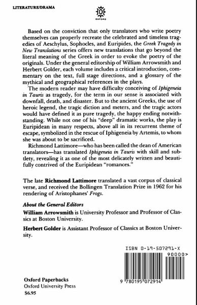 The modern reader may have difficulty conceiving of Iphigeneia in Tauris as tragedy, for the term in our sense is associated with downfall, death, and disaster. But to the ancient Greeks, the use of heroic legend, the tragic diction and meters, and the tragic actors would have defined it as pure tragedy, the happy ending notwithstanding. While not one of his "deep" dramatic works, the play is Euripidean in many respects, above all in its recurrent theme of escape, symbolized in the rescue of Iphigeneia by Artemis, to whom she was about to be sacrificed. Richmond Lattimore--who has been called the dean of American translators--has translated Iphigeneia in Tauris with skill and subtlety, revealing it as one of the most delicately written and beautifully contrived of the Euripidean "romances."