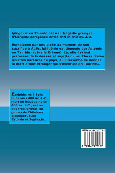 Iphigénie en Tauride est une tragédie grecque d'Euripide composée entre 414 et 412 av. J.-c. Remplacée par une biche au moment de son sacrifice à Aulis, Iphigénie est déposée par Artémis en Tauride (actuelle Crimée). Là, elle devient prêtresse de la déesse et sujette du roi Thoas. Selon les rites barbares du pays, il lui incombe de donner la mort à tout étranger qui s'aventure en Tauride...