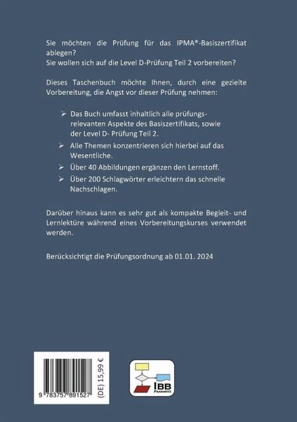 Sie haben vor, die Prüfung zum IPMA®-Basiszertifikat abzulegen? Sie wollen sich auf die Level D-Prüfung Teil 2 vorbereiten?Dieses Taschenbuch möchte Ihnen, durch eine gezielte Vorbereitung, die Angst vor dieser Prüfung nehmen:- Das Buch umfasst inhaltlich alle prüfungsrelevanten Aspekte des Basiszertifikats, sowie der schriftlichen Level D- Prüfung Teil 2- Alle Themen konzentrieren sich hierbei auf das Wesentliche- Über 40 Abbildungen ergänzen den Lernstoff- Über 200 Schlagwörter zum schnellen NachschlagenDarüber hinaus kann es sehr gut als kompakte Begleit- und Lernlektüre während eines Vorbereitungskurses verwendet werden.