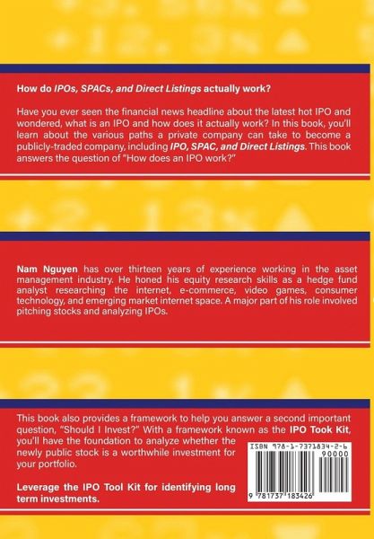 How do IPOs, SPACs, and Direct Listings actually work? Have you ever seen the financial news headline about the latest hot IPO and wondered, what is an IPO and how does it actually work? We'll answer that question by discussing each step of the IPO, the role of investment bankers, how shares are allocated, and how to navigate the S-1 prospectus. You'll also learn about the various paths a private company can take to become a publicly traded company, including IPO, SPAC, and direct listings. Nam Nguyen has over thirteen years of experience working in the asset management industry. He honed his equity research skills as a hedge fund analyst researching the internet, e-commerce, video games, consumer technology, and emerging market internet space. A major part of his role involved pitching stocks and analyzing IPOs. This book also provides a framework, dubbed the "IPO Tool Kit", to help you answer a second important question, "Should I Invest?" The framework includes analysis of secular trends, innovation, market share, brand equity, business model profitability, and valuation methods. With the IPO Tool Kit, you'll have the foundation to analyze whether the newly public stock is a worthwhile investment for your portfolio. Leverage the IPO Tool Kit for identifying long-term investments.
